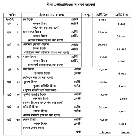 জনাব নীলা চৌধুরী “নীলা এন্টারপ্রাইজ”-এর মালিক। ২০১৭ সালের মার্চ মাসে তাঁর ব্যবসায়ের কতিপয় লেনদেন ছিল নিম্নরূপ: